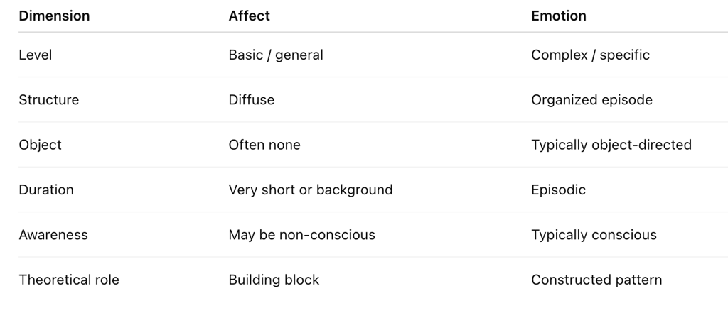 EThe difference between emotion and affect lies mainly in level of analysis, complexity, and temporal structure. They are related but not interchangeable, and different theories draw the boundary slightly differently.